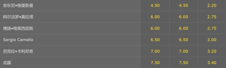 在这份最新的进球赔率上,格里兹曼1赔2.2高居榜首,莫拉塔1赔2.75暂列第二;西班牙人这边进球赔率最低的是格莱西亚斯,和莫拉塔同为1赔2.75;武磊进球赔率则高达1赔3.4,为近几场新高,考虑到马竞的防守状态,武磊本场很可能遭到对方后防的“特殊对待”。