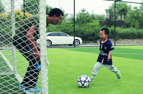 (图)今年父亲节,呼市小朋友王垣晰和爸爸王波在球场上享受亲情和快乐