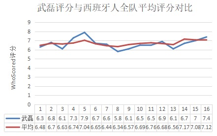 截至本赛季结束,武磊在西甲一共踢了16场比赛,刚开始几场表现都不错,评分也越来越高,从第25轮到第28轮,连续四轮评分高过全队平均评分,加泰德比过后经历了一段低谷期,从第29轮到第32轮,连续四轮评分低于全队平均评分,取得第二粒进球后状态开始回暖,最后4轮评分一场比一场高。16场比赛武磊的平均评分是6.67分,西班牙人全队是6.73分,从评分上来看,和中国很多其他有过留洋经历的人不同,武磊是可以达到西甲平均水平的球员。