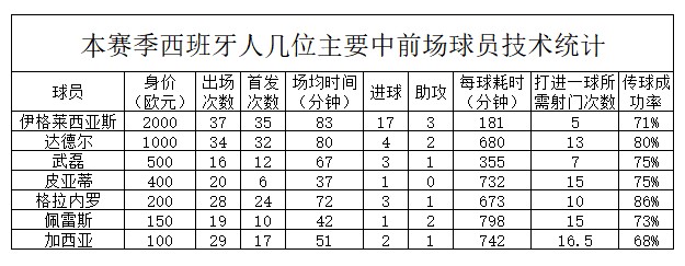 尽管加盟半个赛季3球1助的数据并不算亮眼,但是横向对比西班牙人几位中前场主要球员的数据,我们可以看到,在每球耗时和打进一球所需射门次数上,武磊的进球效率不及队内头号射手伊格莱西亚斯,但是远高过其他几人,传球成功率在前锋中也算比较高的。抛开商业价值不谈,武磊在球场内的表现,也绝对值他的身价。