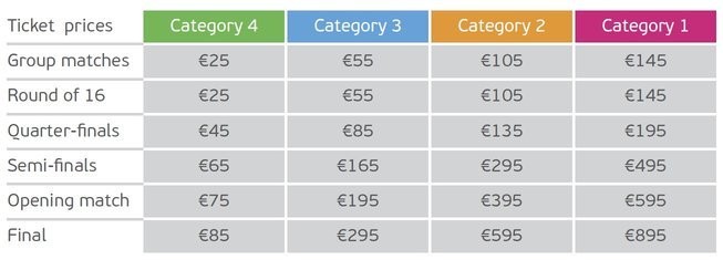 小组赛及八分之一决赛:一等票185欧,二等票125欧,三等票50欧