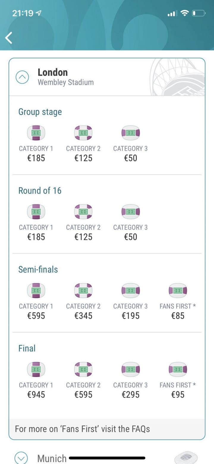 半决赛和决赛专门设立的'Fans First'球票每场各有13000张共计4万张三等票,占温布利球场总容量的15%,可在第一阶段购票时申请。在第一阶段球票申请中未中签的球迷将被自动加入'Fans First'购票组,如有余票将第一时间获得欧足联官方通知并获得优先购买权。