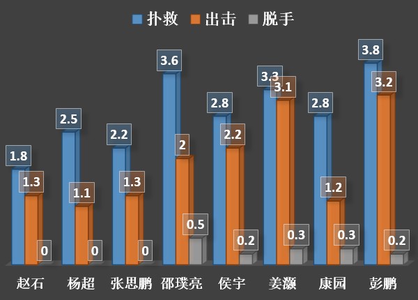 从统计数据概要上可以看到,表现最好的当属上海申花租借到上海申鑫的小门将彭鹏。他场均完成3.8次扑救、3.2次出击,另外只有0.2次脱手。除此之外,姜灏场均3.3次扑救、3.1次出击,也相当出色。侯宇的扑救次数从上赛季的3.9次降低到2.8次,不过这一点也是跟梅州客家的实力上升有关,这名能力最全面的29岁的门将可谓正当年。