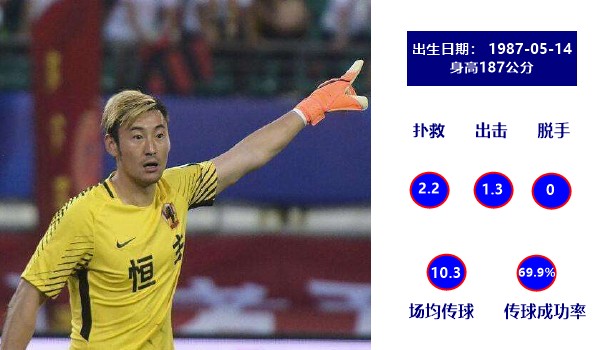 本赛季前10场比赛中,杨超场均2.5次扑救和1.1次出击,没有脱手的情况,以后是非常稳健的发挥。96.2%的短传成功率和33.3%的长传成功率不算出色,不过也能够保证球队正常的后场出球。