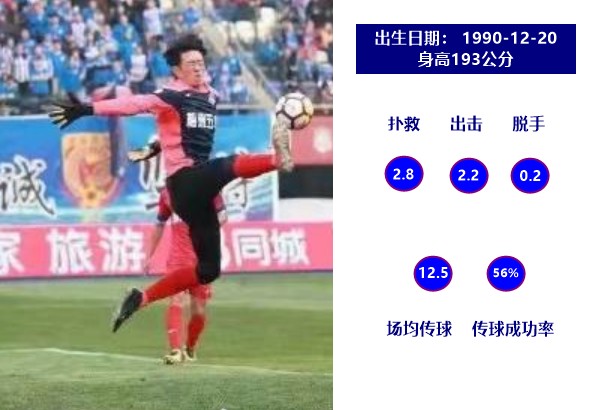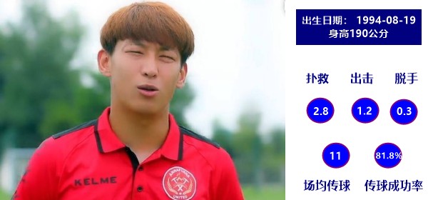 幸运的是,在上赛季末与江苏苏宁解除合同的姜灏,在本赛季加盟北京北体大并成为了球队的主力门将。已经30岁的他,本赛季场均完成3.3次扑救和3.1次出击,却只有0.3次的脱手。场均17.6次传球,有着74%的成功率。其中短传成功率96.4%,长传成功率55.2%,展现了很强的脚下能力。令人稍感遗憾的是他的门线技术略为不足。