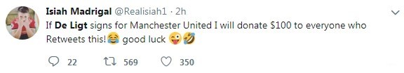 然而,这并不能阻挡球迷们的兴奋之情。一个狂热的球迷评论“如果德利赫特加盟曼联,我会给转发这条推特的每个人100美元!”