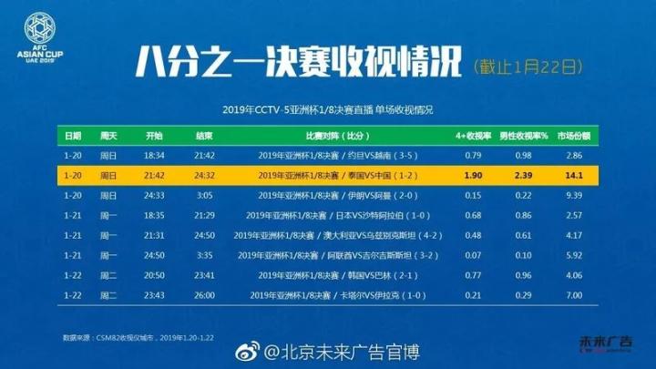 刚过去的阿联酋亚洲杯,东道主遭遇了近年洲际大赛最尴尬的球票销售状况,半决赛东道主大战卡塔尔的海湾德比甚至出现了1.8万张免费球票无人认领的现象,小组赛朝鲜对阵卡塔尔的比赛上座人数低至惨淡的452人。比赛日收入的商业开发,将同样成为中国亚洲杯需要解开的谜团,如果亚洲杯按照过去几届的惯例将举办时间放在年初,如何把准备欢度中国新春佳节的球迷请到球场是非常现实的挑战。值得庆幸的是中国足球唯一的稳定因素就是球迷基数了,2004年那场在家门口的亚洲杯决赛,收视率一度达到惊人的18.5%。根据未来广告收集的数据,阿联酋亚洲杯国足淘汰赛逆转泰国的比赛,4+收视率达到1.9%,男性收视率2.39%,占市场份额14.1%。