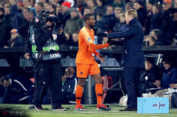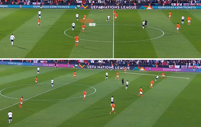 (图)后场三叉戟是这支荷兰队的核心竞争力所在,罗纳德-科曼采用双后腰配置支持弗兰基-德容,并对两名中卫进行保护。上半场中段,荷兰队加强了逼抢的力度,德容不断离开后腰位置向前配合前锋施压,橙衣军团逐渐控制了比赛。