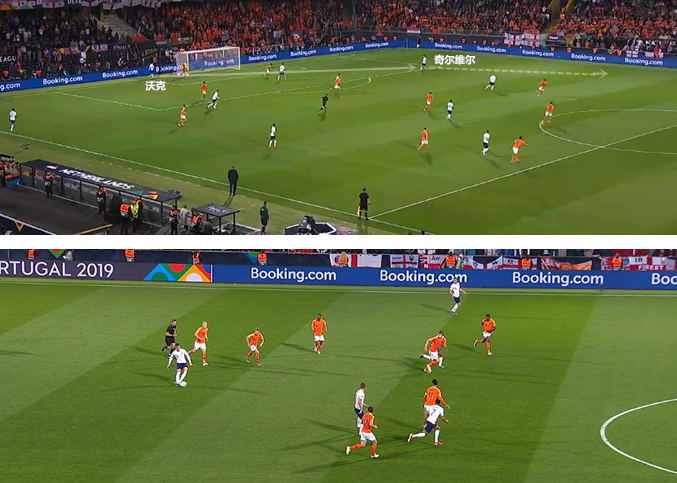 荷兰队扳平比分的进球来自于一次角球进攻,德佩领衔的锋线在阵地战中效率不高。这主要是有三点原因:一是英格兰由三名后腰+两名高大中卫组成的正面防守体系达成了很好的空地联勤效果;二是荷兰队的边路球员个人实力和连续配合能力不强,很难完成推进和爆破任务;三是以德容为首的中场球员在快速推动皮球运转方面做得不够好,荷兰队在进攻中缺少长传和转移调度,慢速且缺乏节奏变化的短传太多,对英格兰防线的撕扯和调动不够充分。