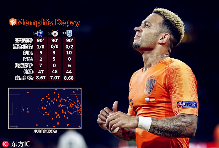 在你来我往的对攻中,荷兰中轴线上的球员有了充分的表现机会。范戴克的防守稳如磐石,德利赫特在完成自我救赎后也逐渐进入了状态,德佩此役的门前效率不佳,但他的接应、拿球和反抢还是对进攻形成了很好的支撑。