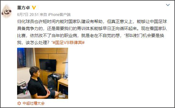 对于这一点,前国脚球员董方卓看的很明白,他在微博上这样写道:“归化球员也许短时间内能对国家队建设有帮助,但真正意义上,能够让中国足球具备竞争力的,还是需要我们的青训体系能够早日正向循环起来……”