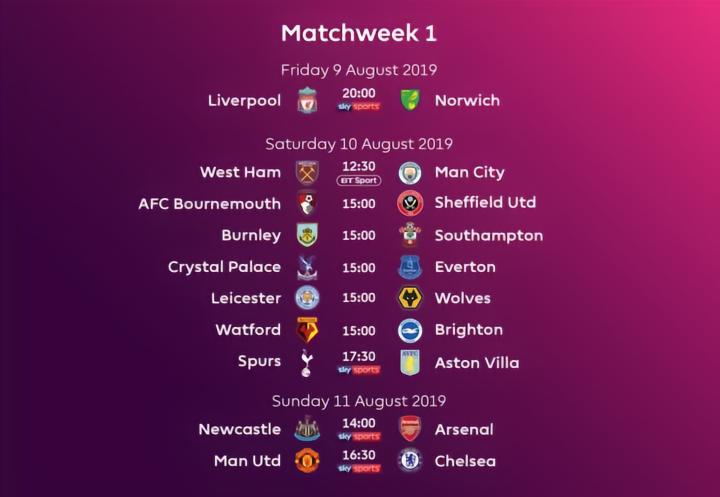 英超19/20赛季赛程出炉,8月10日揭幕战利物浦vs诺维奇,曼联首轮对阵切尔西!