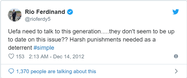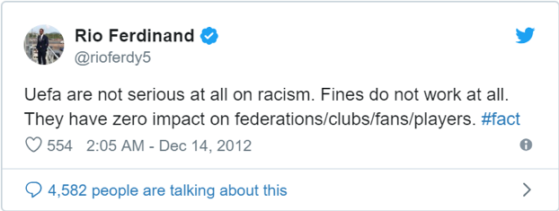 欧足联公布处罚决定后,费迪南德连发推特怒斥欧足联根本就不把种族歧视当一回事(图片截自推特)