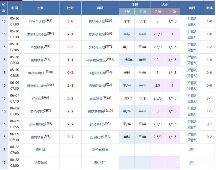 这几个联赛,都是目前正在赛季中的,比较著名的大球联赛。这些赛事的大小球盘口通常会在2.5球盘以上,联赛的整体风格偏开放,进球较多,经常会出现较大比分的比赛。以第15轮美职为例,在已经结束的10场美职赛事中,有8场比赛进球数大于或等于3个,其中纽约城对阵辛辛那提的比赛,更是产生了7粒进球。