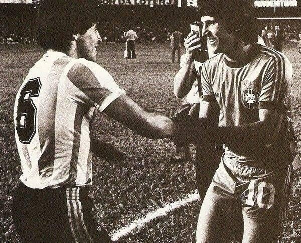 ▲1987年马拉多纳第二次参加美洲杯,赛前和巴尔德拉马握手。
