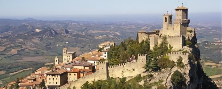 圣马力诺整个国家都位于意大利境内,被称作 “邮票王国”,国旗上的三座城堡在圣马力诺境内仍然保存着,恢弘的城堡犹如三个警卫,时刻警惕着外敌入侵。