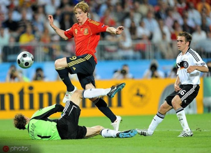 2008年6月30日的维也纳,欧洲杯决赛在西班牙和德国两位巨人间打响,这届杯赛风头正劲的比利亚因伤错过了决赛,命运让托雷斯出任单箭头,赛前出现了无数质疑的声音,而击碎质疑的方式只有一个——在决赛中证明自己。这是一场令人窒息的欧洲杯决赛,比赛的第33分钟,塞纳中圈直传,哈维转身右脚推给禁区前沿的托雷斯,此时正值壮年的拉姆似乎已经卡主身位,然而电光火石之间托雷斯如赤兔般拍马赶到,正可谓“掣断丝缰摇玉辔,火龙飞下九天来,”强行超车抢先一记搓射,莱曼只能目送皮球入网。正是凭借这粒金子般的进球,西班牙时隔40年再次加冕欧陆王者,托雷斯也成为国家英雄……