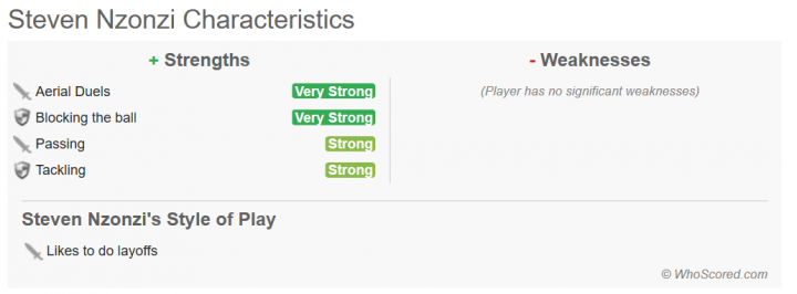 总体来说,恩宗齐是一位能提供场上特定区域的封堵和断球作用,主要任务是短传理顺中场,控制场上节拍,分球组织进攻的组织型后腰。恩宗齐是一位优秀的中场,不过在罗马的比赛里也展现了他在覆盖,保护和运动能力上的不足之处,他拥有不俗的实力,不过在场上的作用还是有着一定的局限性。