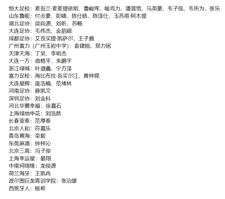 U16男足国家队参赛名单: