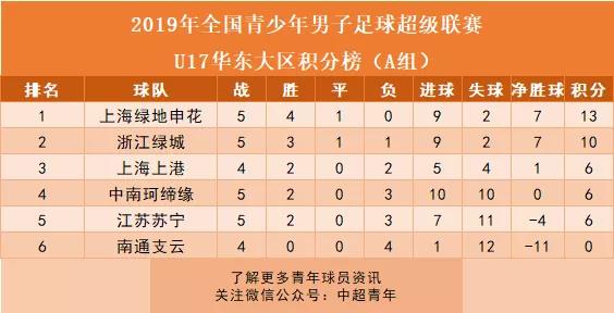 七、青超联赛华东大区:申花U17领跑积分榜。