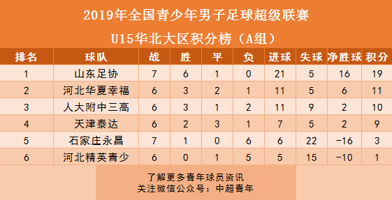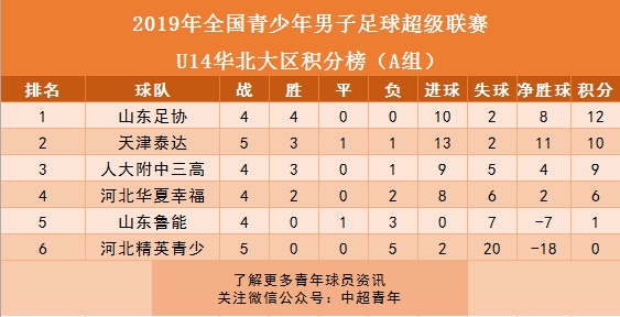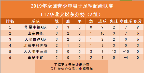 九、青超联赛华北大区:华夏幸福领跑U17积分榜。