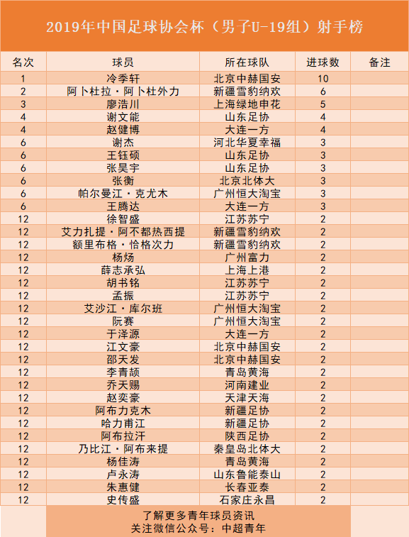六、U19足协杯射手榜:国安冷季轩3场10球。