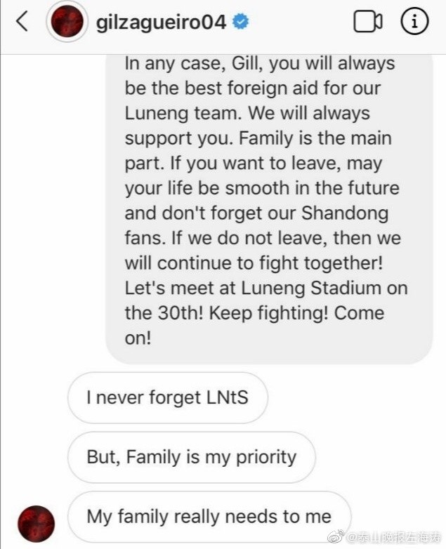 根据左海涛在微博上发出的吉尔的聊天记录,吉尔在社交媒体上亲口承认自己将告别鲁能。他表示永远不会忘记鲁能,但家庭更需要他。