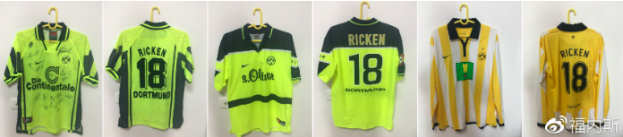 提到佐尔克就不得不提到另一位和他一起共事的多特蒙德前球员——拉尔斯-里肯,这位现在还称自己为“小将“的土生土长多特蒙德人和佐尔克一起经历了多特蒙德最辉煌的时期,在欧冠决赛的进球绝对是多特蒙德球迷无法磨灭的记忆。所以我特别找出了里肯的三件球衣,分别是1996/97赛季的主场球衣、1997/98赛季的主场球衣和2006/07赛季的主场球衣。值得一提的是97/98赛季的球衣,这个赛季的背号在多特蒙德夺冠以后一改传统的黑色印字,变成了金色印字,体现了欧洲冠军的身份。