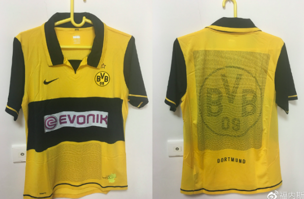 在2002年短暂的辉煌之后多特蒙德便沉入了深深的低谷,战绩不佳、经济危机、万马齐喑、球员出走。在那段时间我也进入了初高中,课业的烦恼日益增多,对于多特蒙德的关注也相应的减少,那时候还没有方便的微博和手机,不能熬夜看球的我需要知道多特蒙德的成绩只有去报刊亭买一份《体坛周刊》来关注自己心爱的球队。而有些昏暗的多特蒙德却依然能在球衣上给球迷惊喜,这段时间我特别选择了几件特别版的球衣,分别是04/05赛季的“德比胜利”纪念版、06/07赛季的主题“保护儿童”的胸前广告版和08/09赛季的客场球衣。特别是2008/09赛季的客场球衣,熟悉多特蒙德的球迷都知道,多特蒙德成立之初的球衣便是胸口有一道绶带的设计,而这件球衣则是对多特蒙德的第一件球衣致敬。