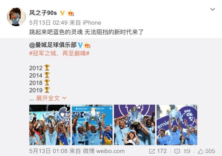 从他的微博中我们也可以看到很多足球的元素。在曼城夺冠后,他发微博:跳起来吧蓝色的灵魂,无法阻挡的新时代来了。