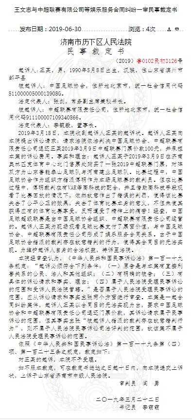 北京时间6月30日,济南市历下区人民法院公布《王文志与中超联赛有限公司等娱乐服务合同纠纷一审民事裁定书》。根据裁定书,因裁判傅明的判罚,山东球迷状告中国足协及中超公司,法院不予受理。