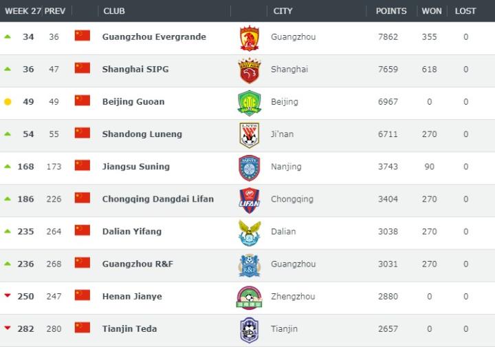 除此之外,北京国安排名不变,仍为世界第49名;山东鲁能排名上升1位,排在世界第54;江苏苏宁上升5位,排在世界第168;重庆斯威上升40位,排在世界第186。