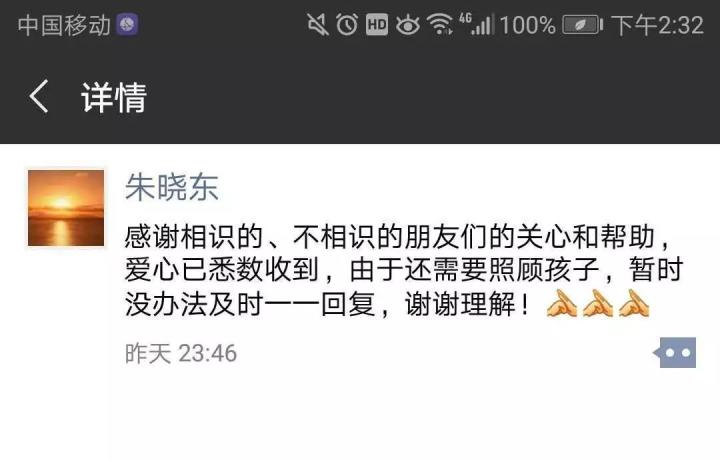 对此,朱晓东发了一条朋友圈,感谢捐款的爱心人士:“感谢相识的、不相识的朋友们的关心和帮助,爱心已悉数收到,由于还需要照顾孩子,暂时没办法及时一一回复,谢谢理解!”