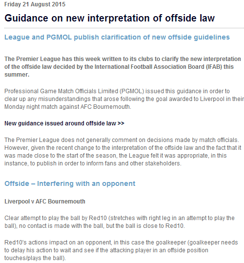 (图)英超官方甚至发表声明:“英超一般不评价裁判的判罚,但由于越位规则的改变以及新赛季刚刚开始,英超认为发表这份说明告知球迷和其他股东是合适的。库蒂尼奥在球靠近他时只需要试图接球就能影响门将,这符合新的越位规则。”