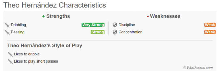 特奥身高186cm,体重81kg,司职左边后卫的法国人拥有很强的速度和对抗能力,他的推进能力也很出色。特奥最出色的地方无疑是他在进攻端展现的冲击力,这位年轻的法国边后卫酷爱进攻,他的身体素质出色,不管是爆发力还是速度都很快,这让他在边路能强行超车,而特奥的身体也很强壮,他也时常利用自己的身体和速度带球冲击对方的防线,在持球向前突破的方面,特奥能给球队带来不小帮助,他是左边路的一个重要的有球推进点,可以缓解边锋的压力。