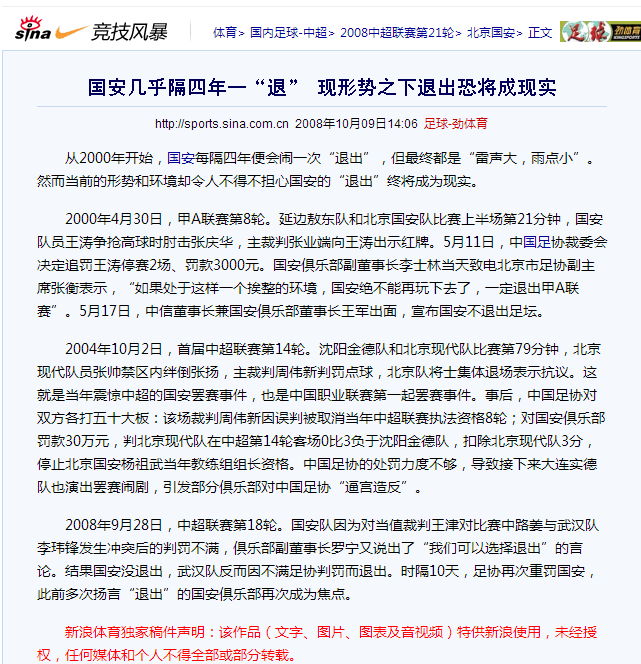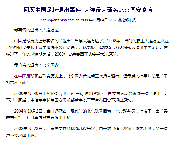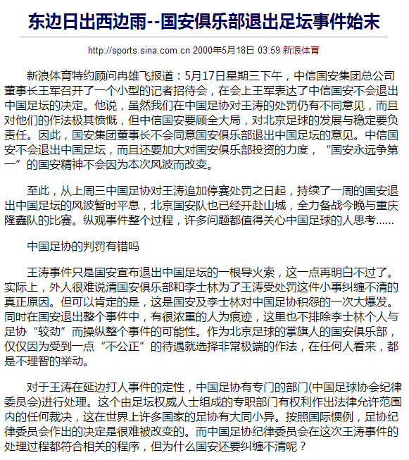 “实际上,综观整个事件始末,中信国安在“退出”足坛问题上的矛盾心理一览无遗。国安最初与足协对峙的初衷,无外乎是想通过一些“过激”言行制造舆论影响,给中国足协纪律委员会施加压力,并最终达到提前“解放”王涛的目的。”
