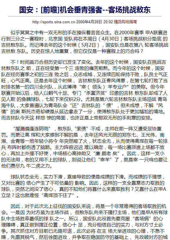 “......但是至少在北京球迷各界及俱乐部看来,中国足协并没有给他们足够的“回报”,而且在国安俱乐部最困难的时候“落井下石”,对王涛加罚一轮的处罚很肯能够导致本赛季战绩不佳的国安在下面的比赛中处于更加险恶的境地。近几轮他们连续遭遇重庆、山东等劲旅,本来就实力不济的国安队又缺少了王涛,接下来很可能遭遇连败的挫折,这也可能是国安超乎想象地重视王涛事件的深刻原因。”