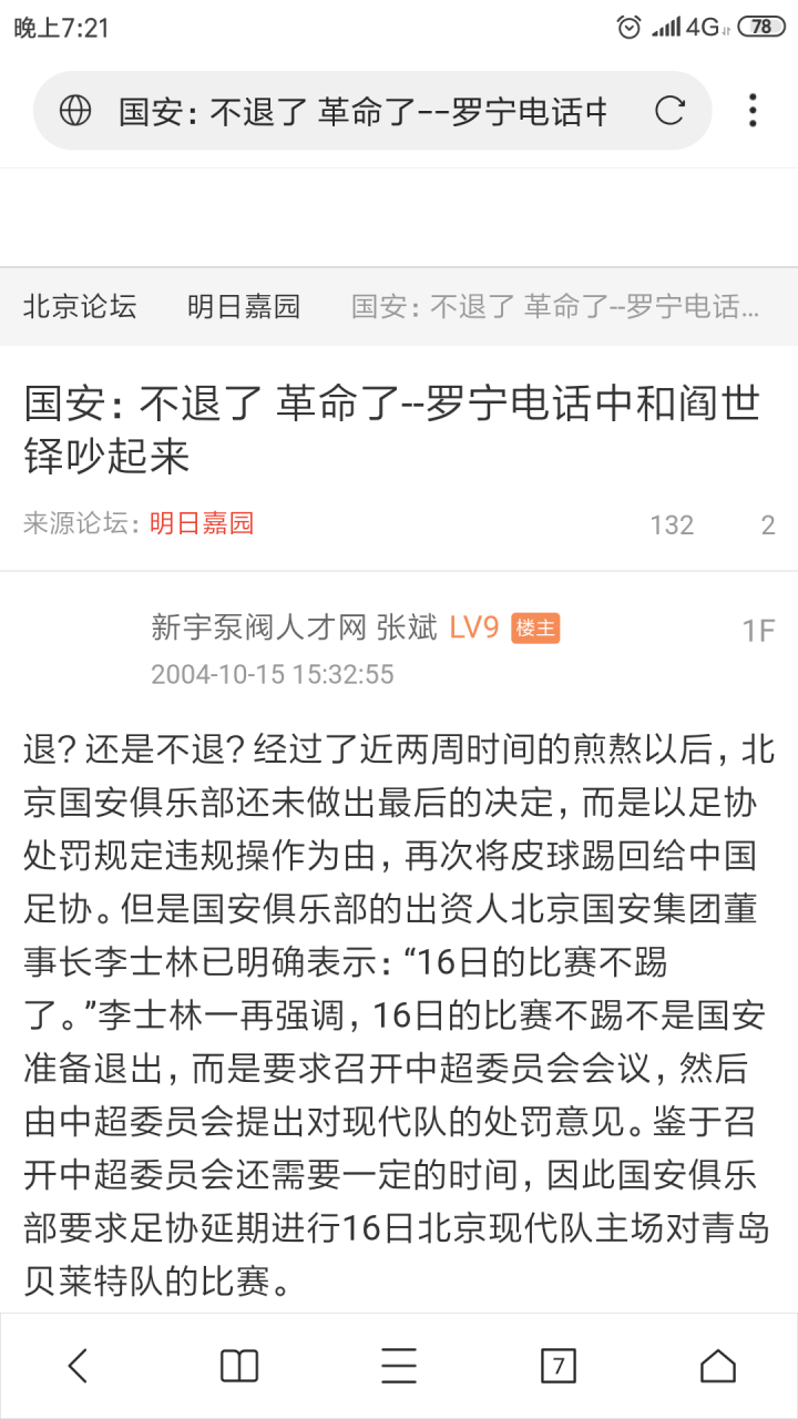 2004年10月14日,当晚,大连实德董事长徐明出现在国安俱乐部。“G7革命”爆发。
