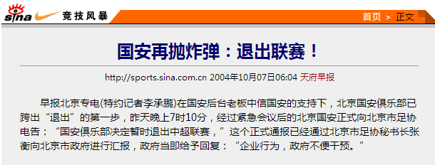 2004年10月5日19时10分,北京国安正式向北京市足协电告:“国安俱乐部决定暂时退出中超联赛”,这个正式通报已经通过北京市足协秘书长张衡向北京市政府进行汇报,政府当即给予回复:“企业行为,政府不便干预”。