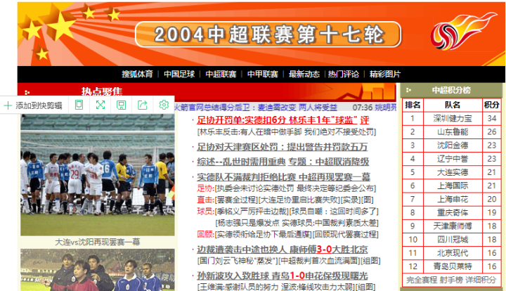 2004年10月23日,中超联赛第17轮积分榜