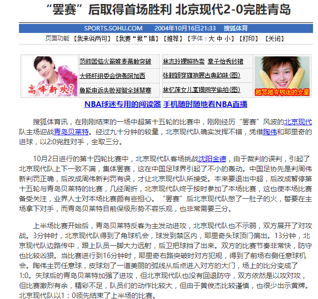 2004年10月16日,中超联赛第15轮北京国安坐镇主场2-0完胜青岛。
