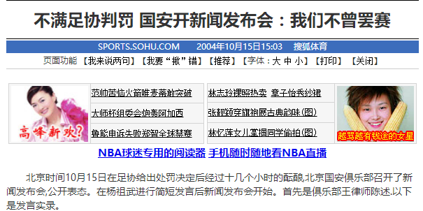 2004年10月14日,北京国安召开新闻发布会:我们不曾罢赛,对足协判罚不满。
