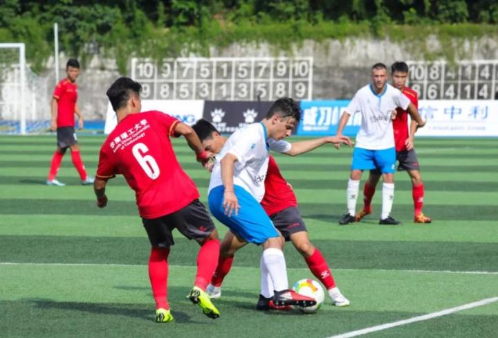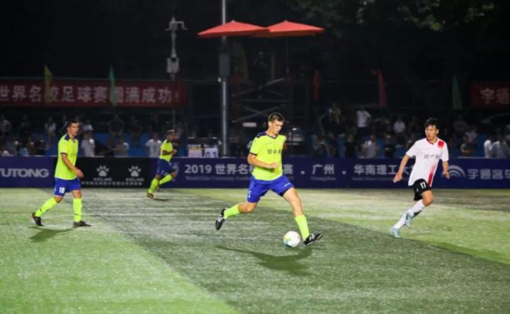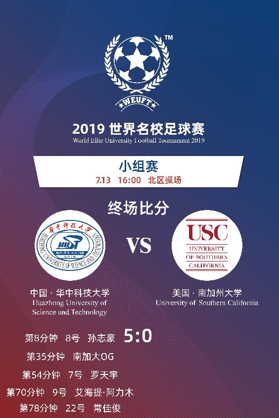 北京时间7月13日下午4:00,2019世界名校足球赛B组小组赛第一轮在华南理工大学北区足球场打响,由华中科技大学迎战来自美国的南加州大学。前者身着白色上衣黑色短裤,后者身穿橙色上衣黑色短裤。上半场华中大8号孙志豪首开记录,南加大后防失误打入乌龙球。下半场华中大7号罗天宇、9号艾海提·阿力木、22号常佳俊各进一球多点开花。最终华中科技大学5-0战胜南加州大学,以一场胜利开启了这次的华工足球之旅。