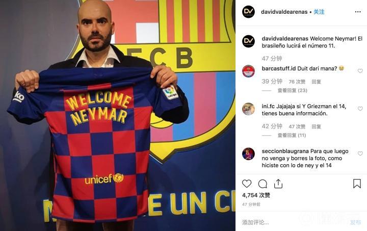 大卫-巴尔德亚雷纳斯(David Valdearenas)是前巴萨室内足球球员,目前他在专门跟踪报道巴萨的电视节目《EL 10 DEL BARÇA》担任主持人,他刚刚在个人Instagram晒出印有“欢迎内马尔”字样的巴萨新赛季球衣,称巴黎球星回老东家后将身披11号战袍。