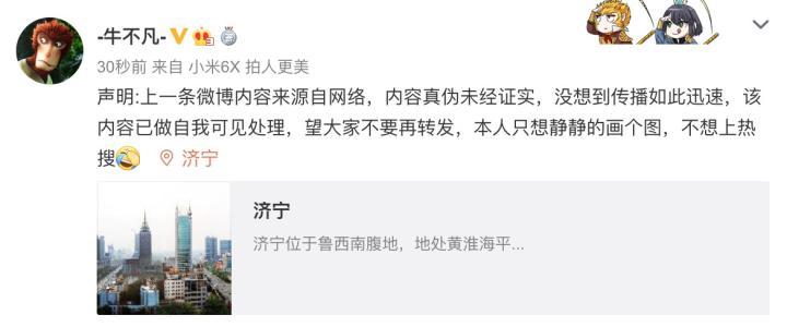 不过他又在此后表示,“上一条微博内容来源自网络,内容真伪未经证实,没想到传播如此迅速,该内容已做自我可见处理,望大家不要再转发,本人只想静静的画个图,不想上热搜。”