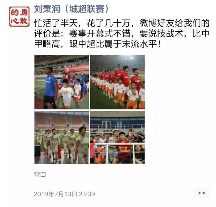 郑言足球7月13日,2019年城市足球超级联赛开幕了!揭幕战中,坐镇主场的营口超越最终3比0战胜洛阳花都。赛后,城超联赛创始人刘秉润发了这样一条微博——忙活了半天,花了几十万,微博好友给我们的评价:赛事开幕式不错,要论技战术,比中甲略高、跟中超比属于末流水平!