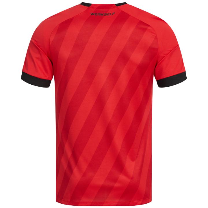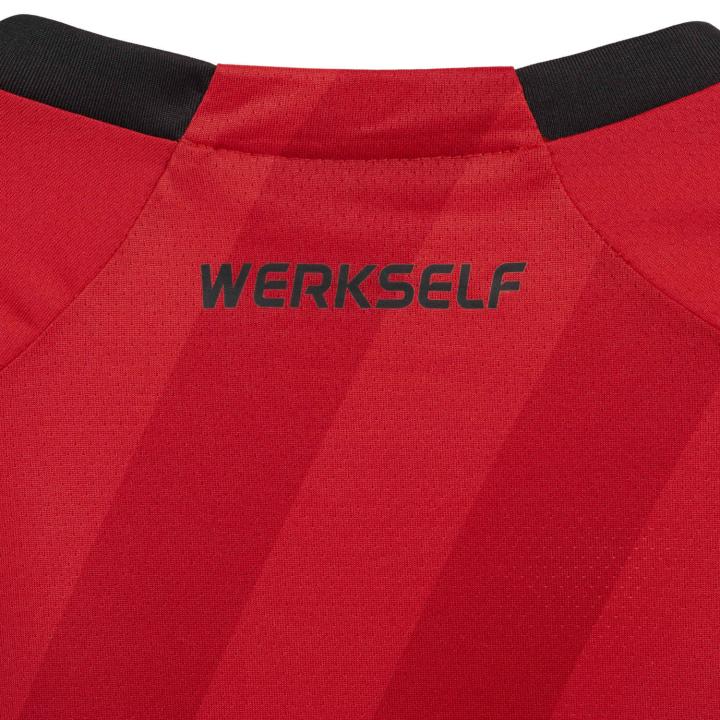 对俱乐部意义重大的红色则成为新赛季勒沃库森主场球衣的主角,深浅不同的两种红色斜纹让这件全新主场战袍动感十足。带有黑色细节装饰的V领背后加入耳熟能详的球队口号“Werkself”(药厂十一人)。红色球裤与带有黑色环纹的红色球袜一同组成充满经典风格的“药厂”新赛季主场形象。
