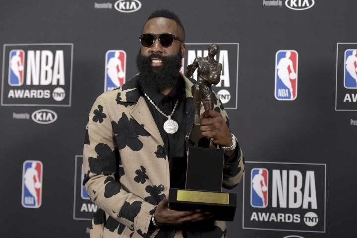 (哈登领取常规赛MVP奖杯)