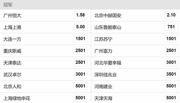 其他球队,山东鲁能1赔751暂列第四,大连一方和江苏苏宁均以1赔1501并列第五。北京人和、河南建业、上海申花、天津天海则均以1赔5001垫底。