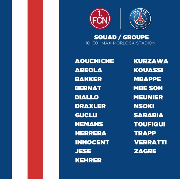 北京时间7月21日明天,巴黎圣日耳曼将迎来他们季前赛的第二个对手纽伦堡队,赛前巴黎圣日耳曼公布了他们的大名单。姆巴佩领衔阵容,内马尔缺席。